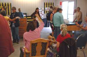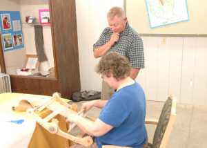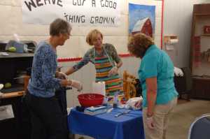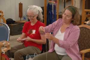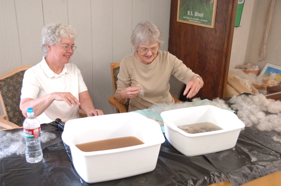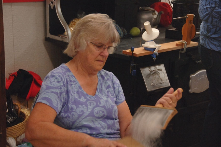 This year we had a special demonstration of the stages of wool processing. Using a Romney fleece from a sheep at Spring Hill Farm, we showed: washing, carding, spinning, dyeing, and weaving.