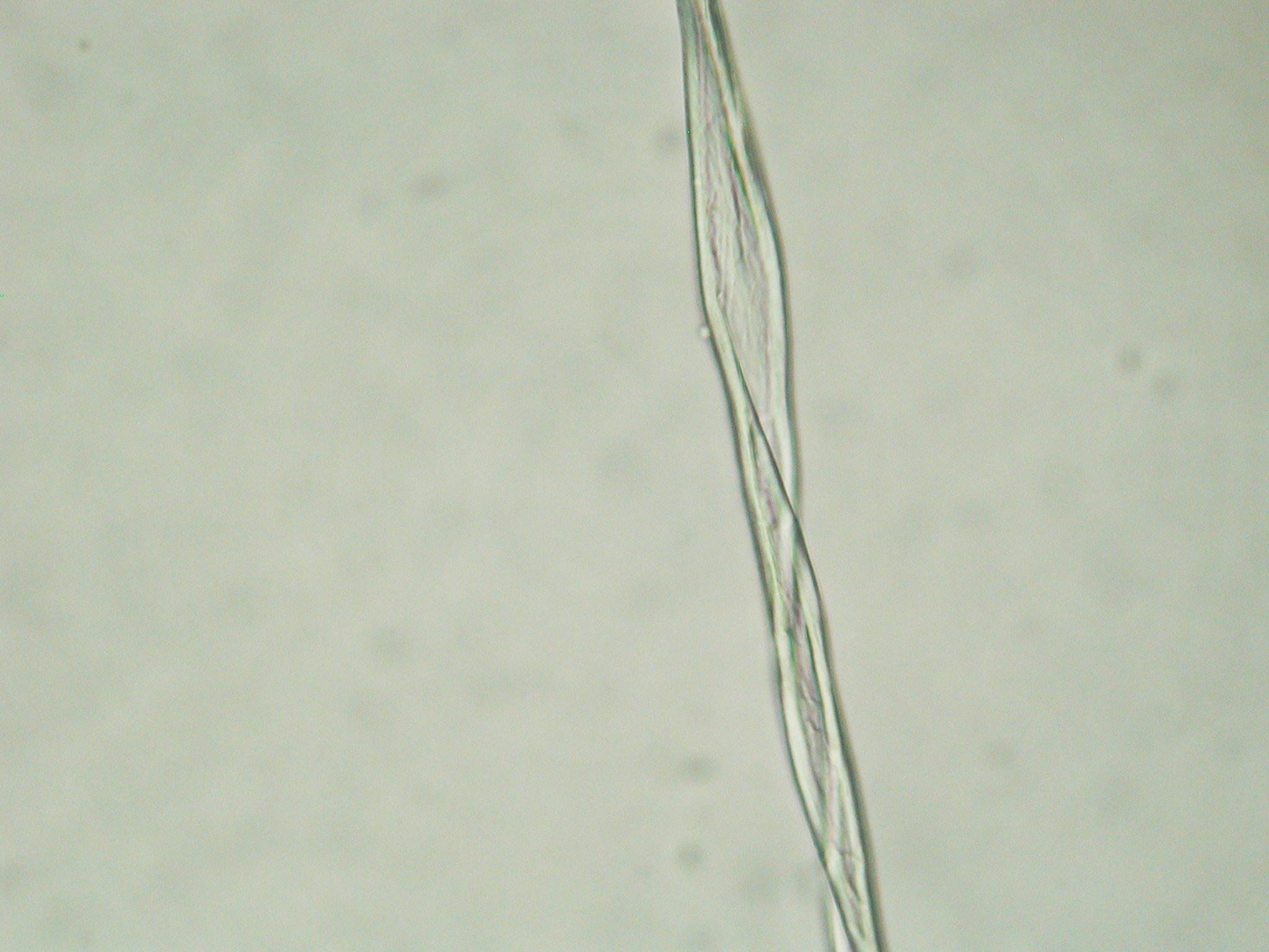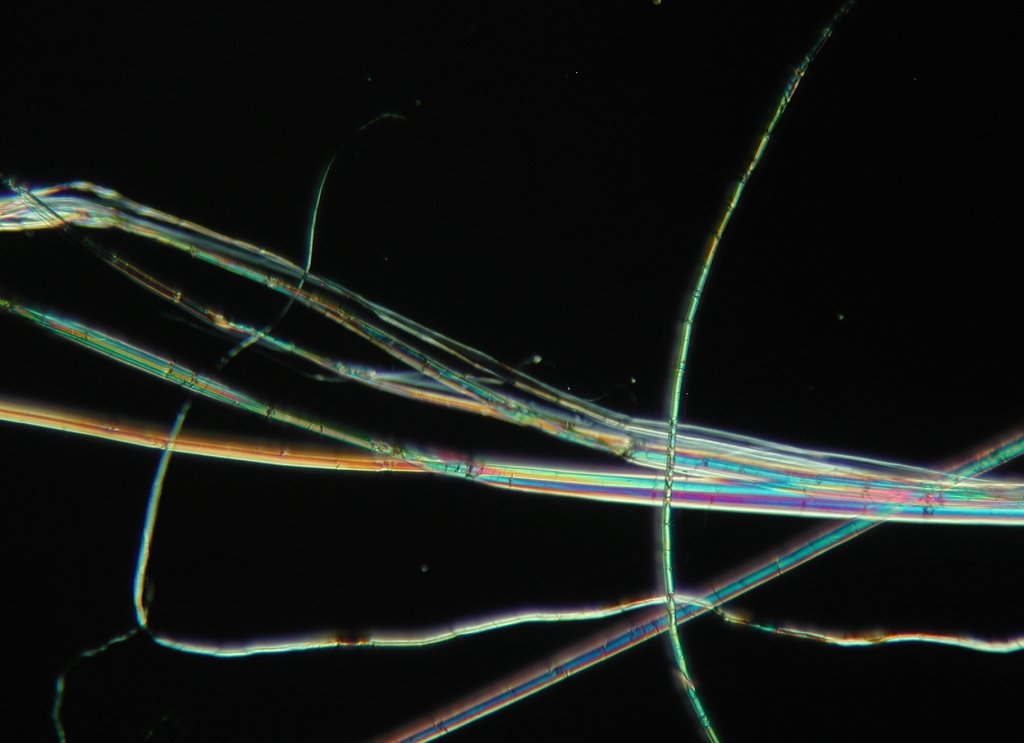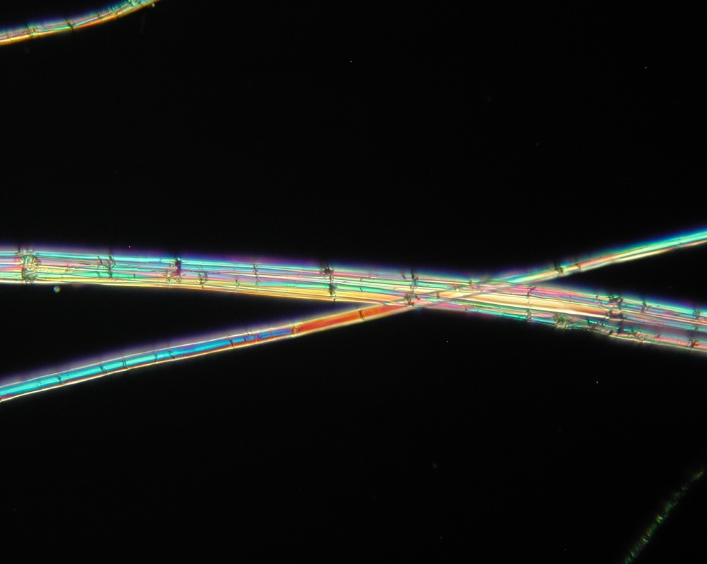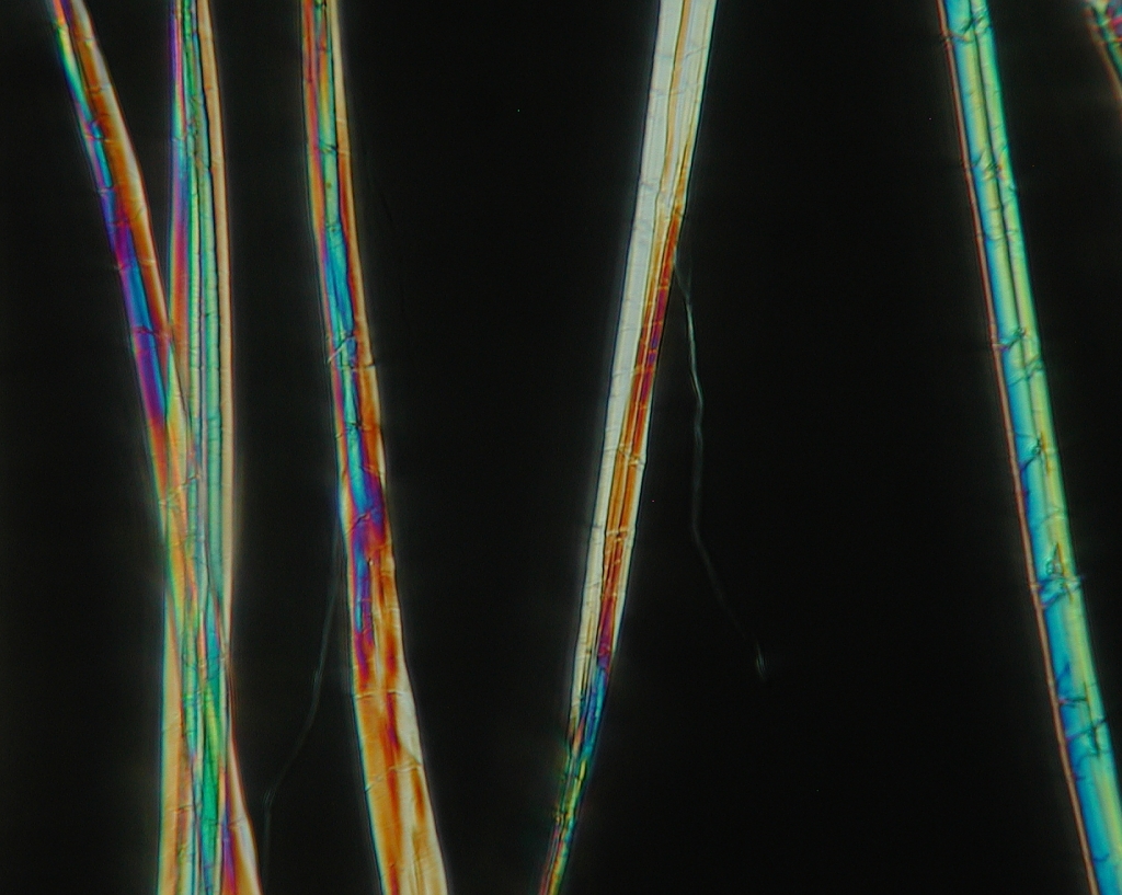 When using a microscope to look at fibers from a textile or a yarn, one can without too much difficulty determine the general category of the fiber. The pictures on this page show several plant fibers. Included are cotton and the bast fibers flax (known as linen when spun), hemp, and ramie. Go to the other pages to see other interesting fibers.