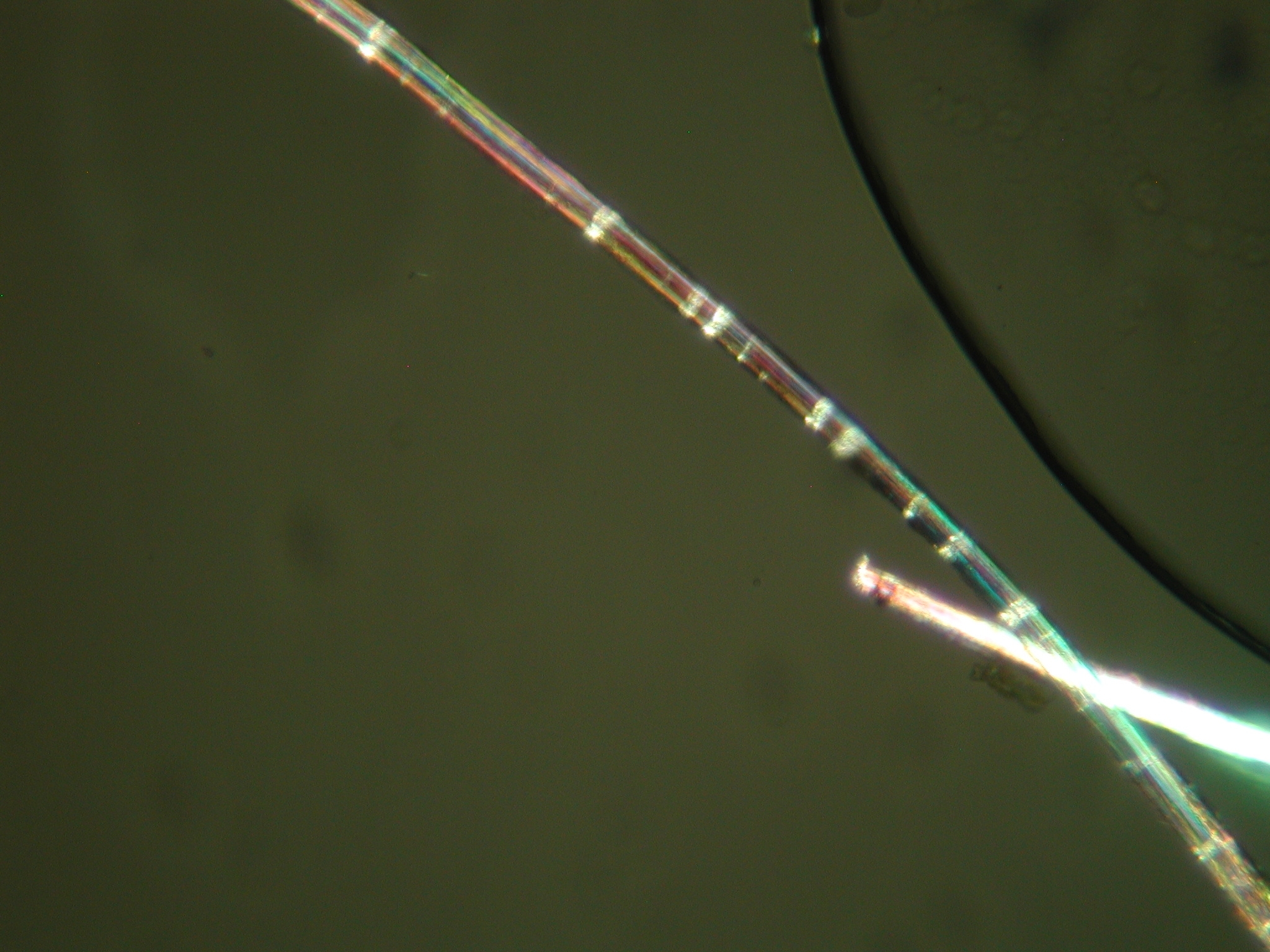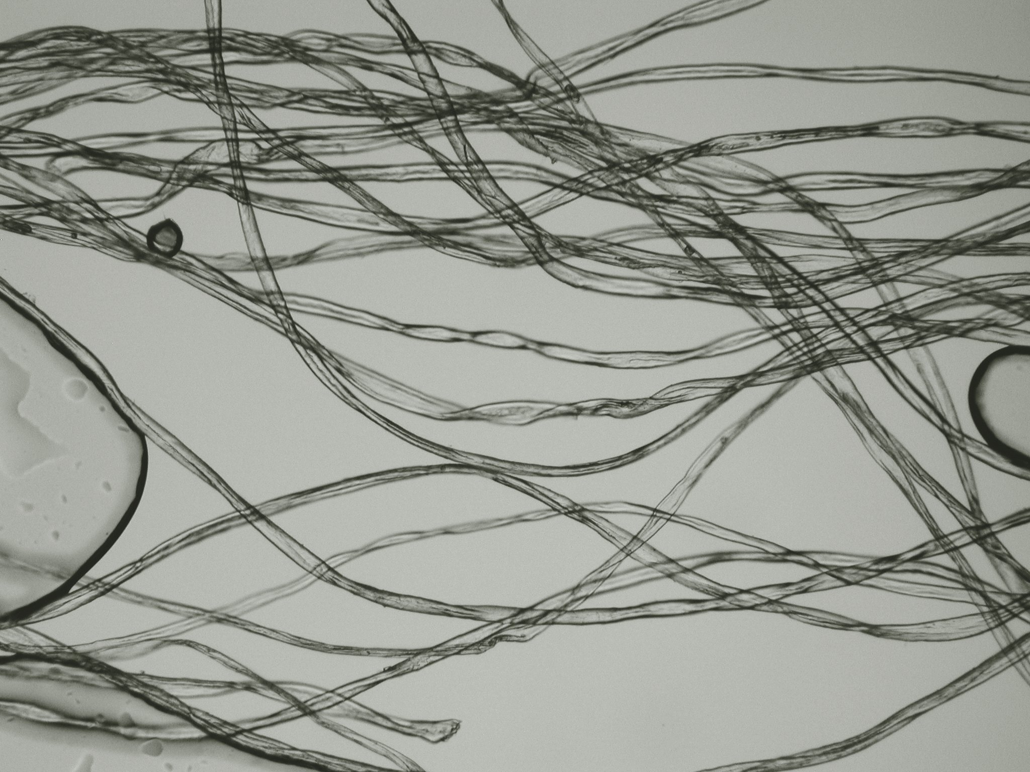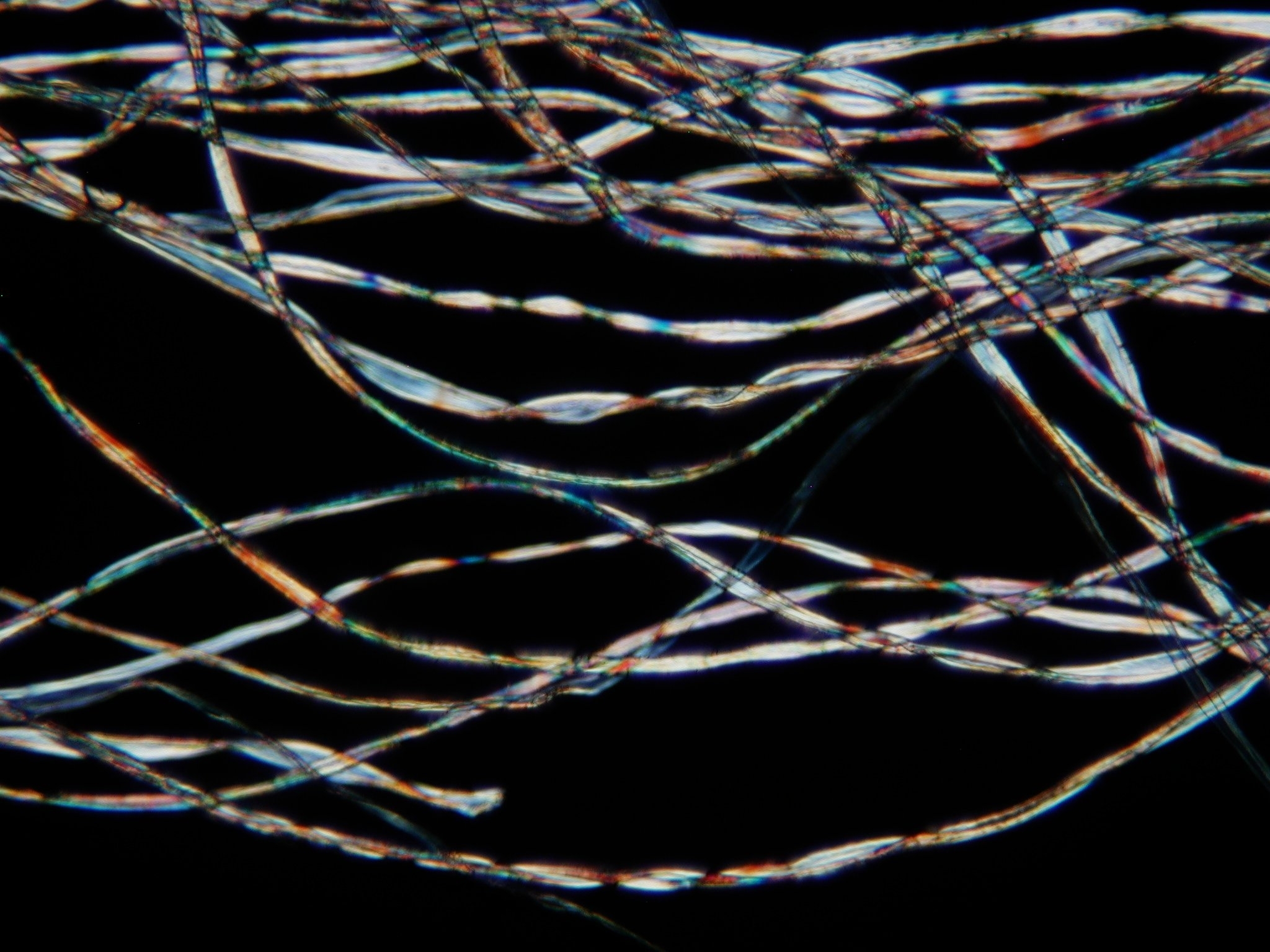 When using a microscope to look at fibers from a textile or a yarn, one can without too much difficulty determine the general category of the fiber. The pictures on this page show several plant fibers. Included are cotton and the bast fibers flax (known as linen when spun), hemp, and ramie. Go to the other pages to see other interesting fibers.