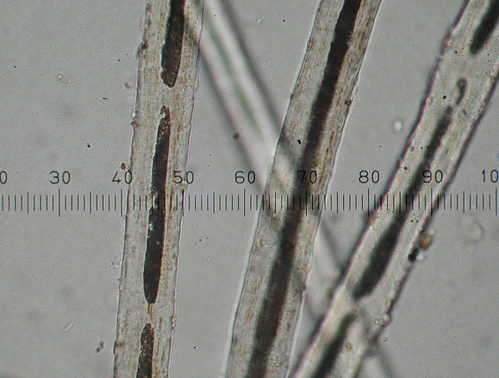 Alpaca, 400x. Another view showing the size and also the medullation of three fibers. The fiber on the left goes from 41 to 50, so it is 9 units in diameter. That means it is about 22.5 microns (9 x 2.5). Notice the blurry, faint image of one fiber crossing the other fibers; this fiber is not on the same level as the other fibers so is out of focus. |