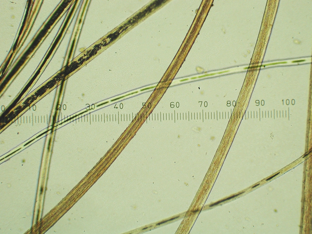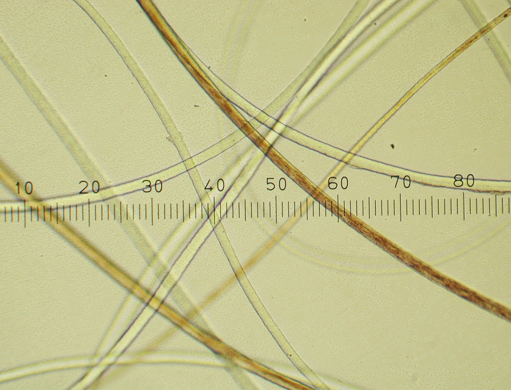 Alpaca, 100x. Each division of the graduated scale is approximately 10 microns at the 100x magnification. Notice the variability in size of the fibers. These fibers were all taken from one lock of an alpaca fleece. |