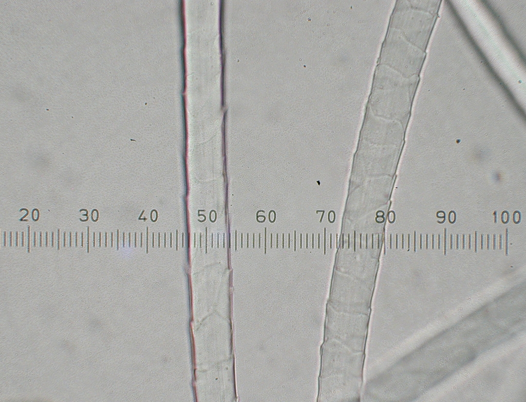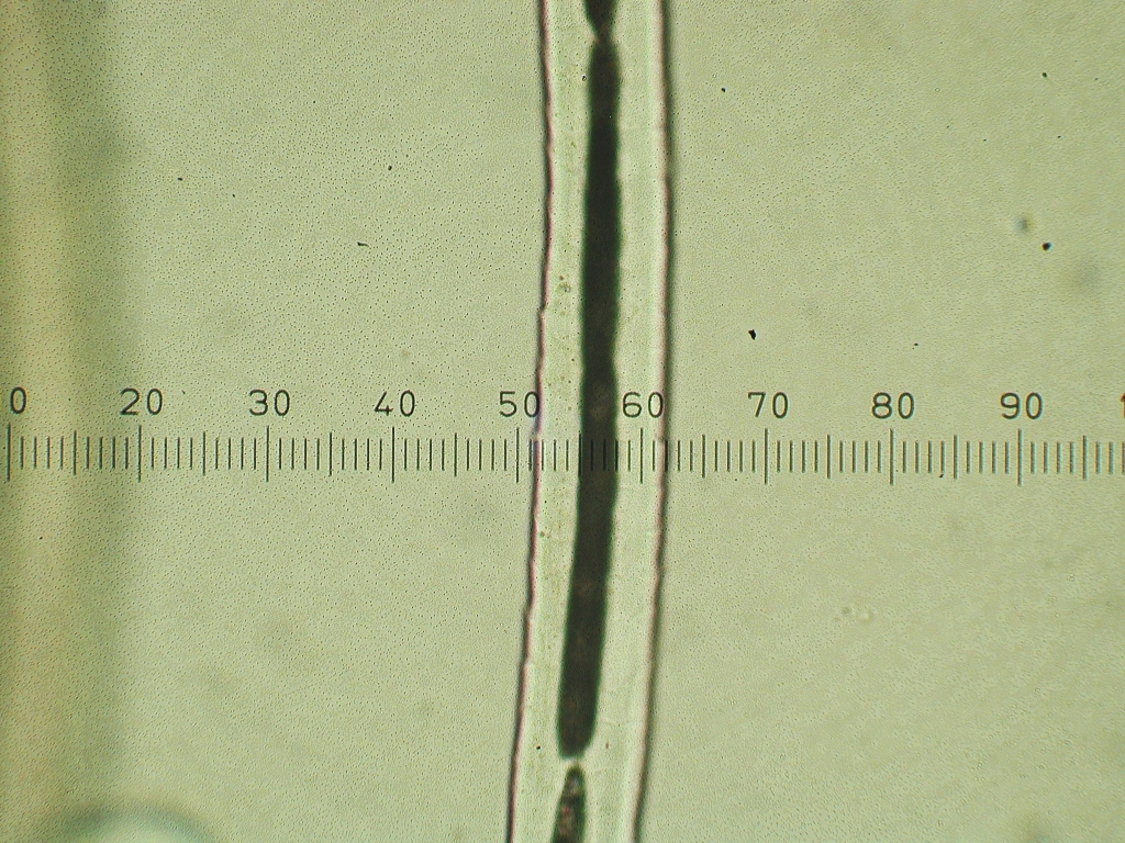 Alpaca, 400x. Here one can see how to measure one fiber, but since the fibers of the whole fleece are so variable a lot more measurements would need to be taken to characterize the range and distribution of fiber sizes in the fleece. At 400x, each division of the scale is 2.5 microns approximately. |