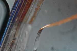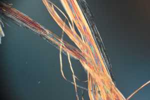 Notice the individual fiber on the right...it has a flattened appearance as it courses up and to the right; again suggesting a relatively flat fiber. Also notice the short cross hatches in the blue colored fibers on the left. Those may represent some surface kinking or other irregularities. The sharply circumscribed black object on the left is an air bubble. |