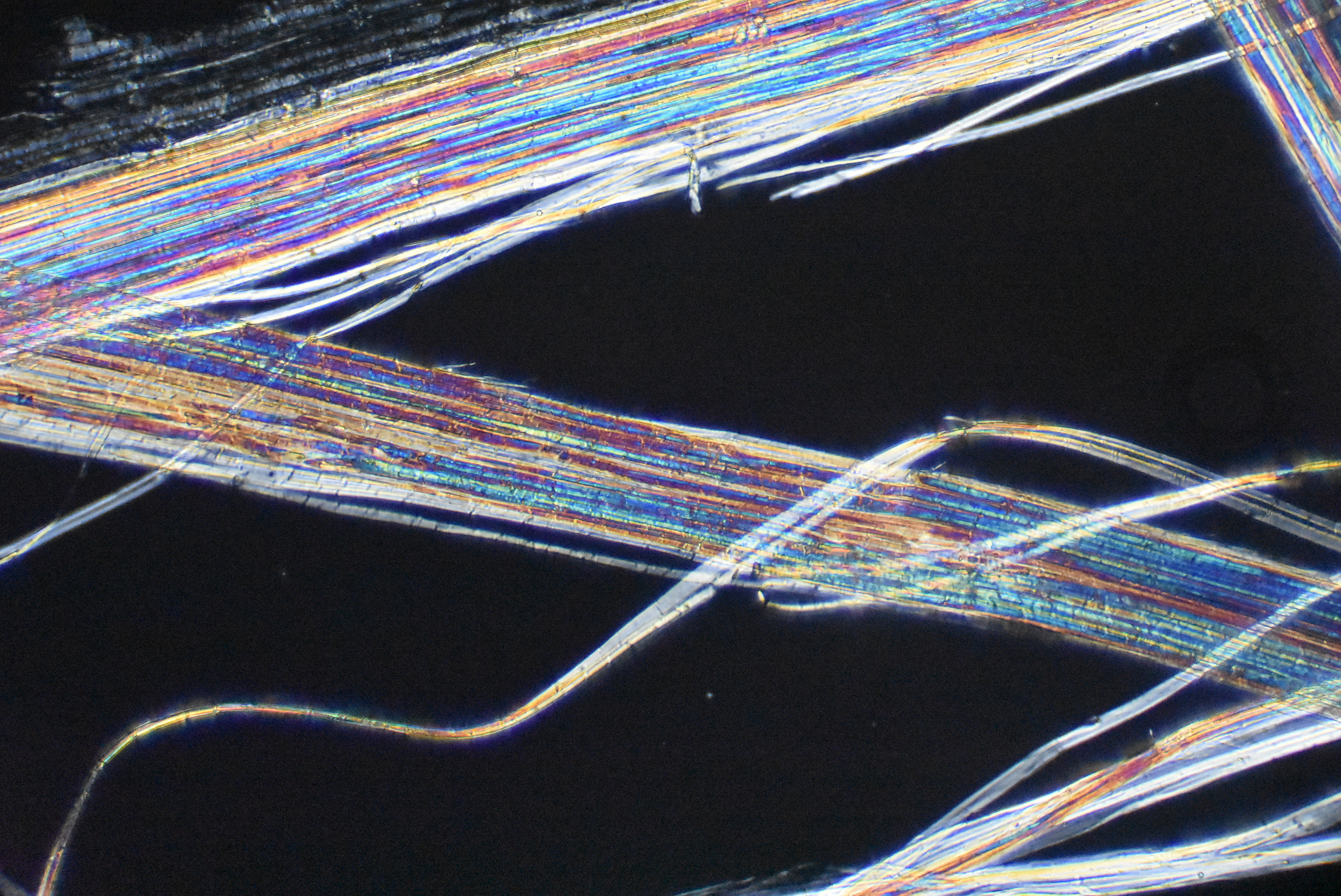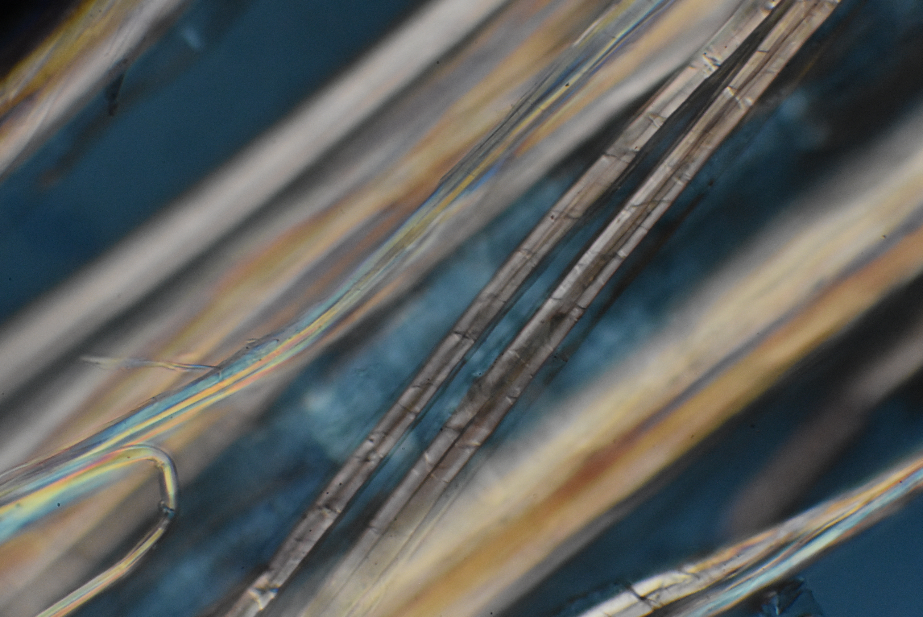 This is another polarization microscopic view showing several individual fibers exhibiting cross hatches. The outside of the fibers appears smooth. |