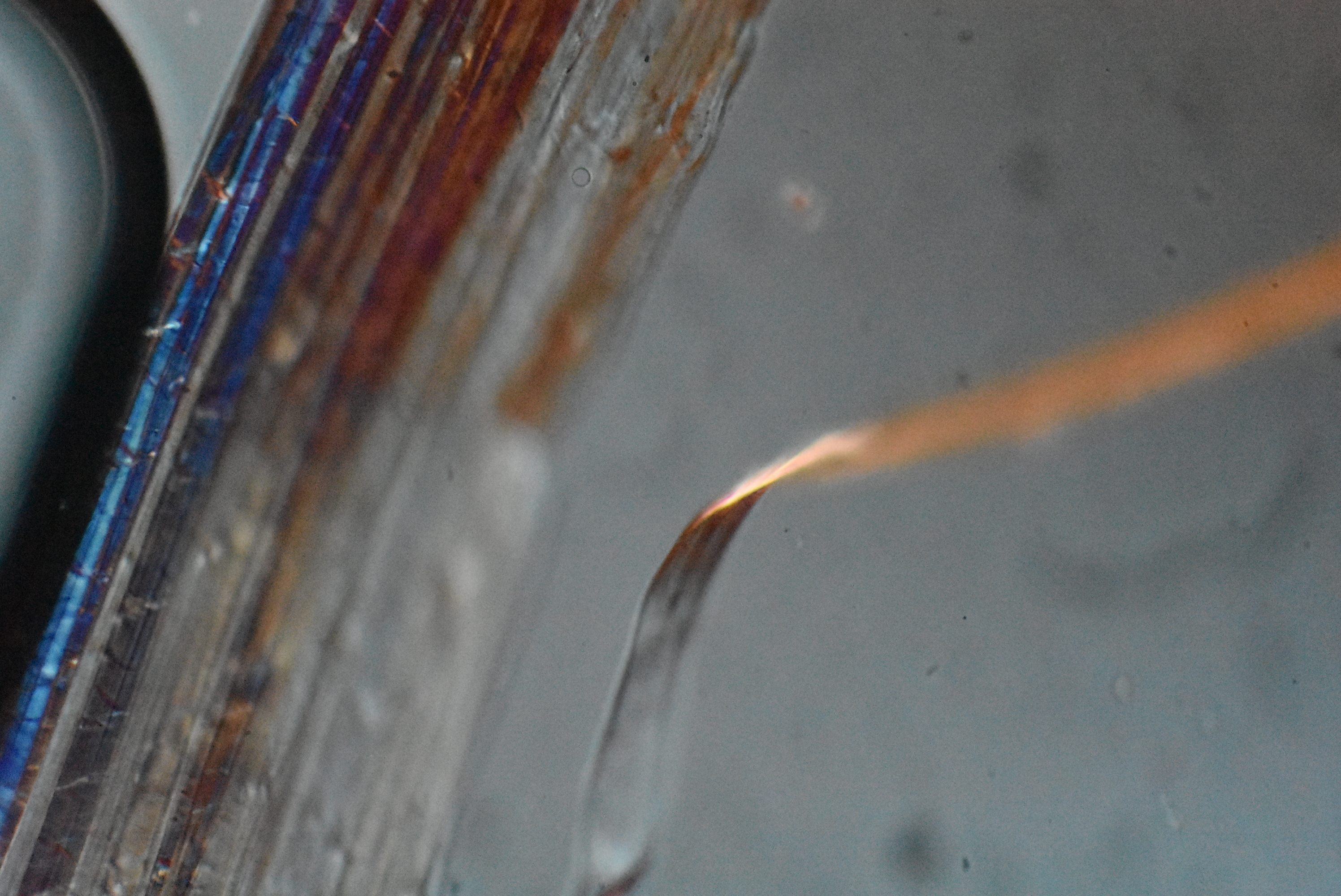 Another polarization microscopic view showing a single fiber in the foreground twisting slightly as it courses up and to the right. Again, the fiber appears somewhat flat. There is small air bubble at the upper left. |