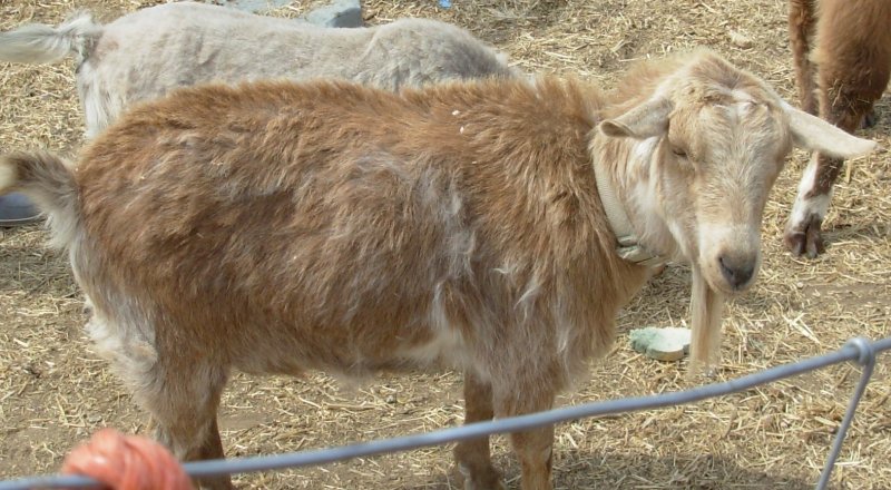 Dark brown llama and geese Women looking at apple box which contains llama fleece Several people feeling fleece for fineness