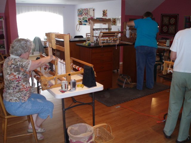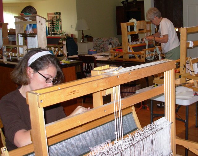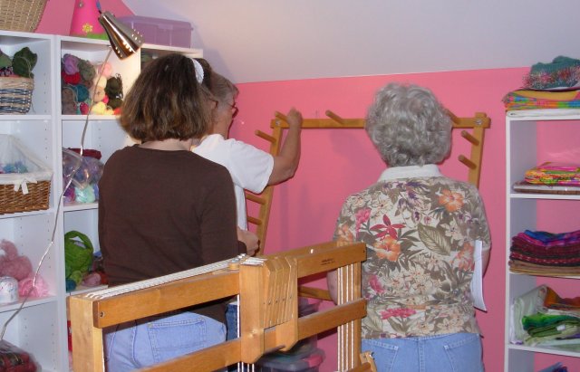 Learning how to wind warp Checking accuracy Girl weaving on Baby Wolf loom